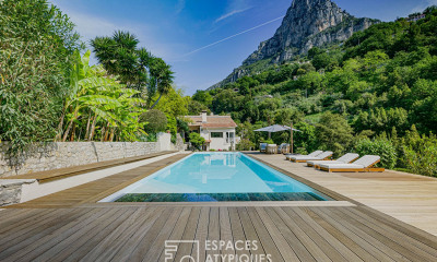 À l'extérieur, la propriété déploie un jardin luxuriant planté d'eucalyptus, de pins et de biens d'autres espèces méditerranéennes. Une vaste terrasse en pierre accueille les moments de détente en plein air, tandis qu'une piscine élégamment intégrée au décor s'accompagne d'une superbe plage en bois agrémentée de bananiers, de yukas ainsi qu'un espace repas couvert.