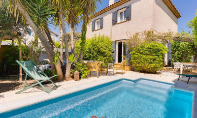 À l'extérieur, vous profiterez d'une agréable terrasse en travertin avec partie couverte, ainsi que d'un bel espace piscine avec bassin en béton carrelé et plages aménagées, dans un jardin arboré, sans aucun vis-à-vis, offrant calme et intimité.