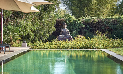 À l’écart, un espace piscine raffiné invite à la détente : sa piscine miroir, aux lignes pures, s’ouvre sur un champ d’oliviers, offrant un décor tout en perspective, baigné de lumière et de sérénité.