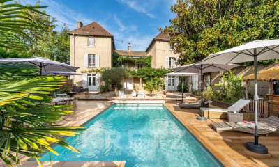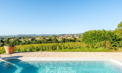 Les extérieurs révèlent tout le caractère unique de cette maison. La piscine traditionnelle, idéalement orientée, profite d'une vue imprenable sur les coteaux du Beaujolais et sur un paysage sans aucun vis-à-vis. Un ancien four à pain subsiste dans les dépendances, témoin de l'histoire du lieu et apportant une touche authentique. Le jardin, bordé de vignes, confère une atmosphère paisible, propice à la détente et à la convivialité, tandis que les vestiges de l'ancienne orangerie enrichissent la façade d'un caractère singulier.