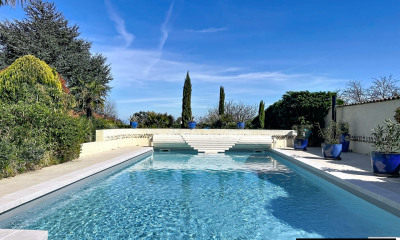 L'extérieur est à la hauteur avec plus de 60 m² de terrasse en partie abritée, face au jardin sans vis-à-vis avec sa piscine fond plat à la gestion entièrement automatisée (filtration sel, volet immergé) et son espace solarium en attente.