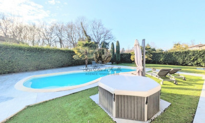 La propriété bénéficie d'équipements de qualité, avec une piscine Difazur réalisée en 2019, chauffée par pompe à chaleur et bénéficiant d'une garantie à vie. Le chauffage est assuré par une chaudière gaz associée à un chauffage au sol, complété par une pompe à chaleur réversible pour la climatisation. Les menuiseries en aluminium double vitrage et les volets roulants motorisés participent au confort thermique et acoustique, tandis que la maison affiche un classement énergétique B.