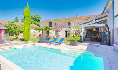 La parcelle paysagée accueille une piscine de 7m x 3,5 m, avec escalier roman. Le bien est équipé de menuiseries aluminium double vitrage phonique, de volets roulants isolants, dont certains solaires, d'un système d'alarme, d'un visiophone, ainsi que d'un puits raccordé à un système d'arrosage.