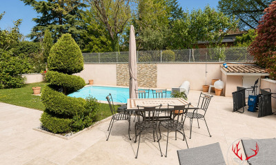 À l'extérieur, le jardin clos et arboré accueille une piscine idéalement intégrée dans son environnement. Son exposition Sud, Est et Ouest assure un ensoleillement constant tout au long de la journée, offrant un cadre de vie privilégié en toute saison. Les espaces extérieurs, à la fois conviviaux et intimistes, se prêtent aussi bien à la détente qu'à la réception.