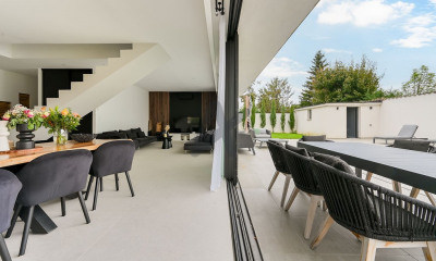On découvre une vaste pièce de vie d'environ 63 m², où la cuisine ouverte fait face au séjour, avec un bel espace structuré par un escalier au design soigné. À l'arrière, une terrasse intimiste prolonge l'ensemble, avec vue sur le couloir de nage chauffé, exposé sud-ouest, qui devient naturellement le fil conducteur entre l'intérieur et l'extérieur.