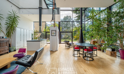 La pièce de vie, véritable coeur battant de la maison, impressionne par ses 8 mètres sous plafond et ses vastes murs vitrées, donnant une sensation unique de vivre à l'extérieur tout en étant à l'intérieur. Cet espace baigné de lumière naturelle offre une continuité harmonieuse avec le jardin environnant, invitant à une immersion totale dans la nature sans quitter le confort de votre foyer. Cet espace, qui invite aux moments de partage, est magnifié par une impressionnante cheminée, offrant un coin propice aux moments de détente et de lecture. La cuisine ouverte, aux lignes contemporaines et entièrement équipée, au centre de cette pièce spectaculaire, devient le lieu de rassemblement par excellence.