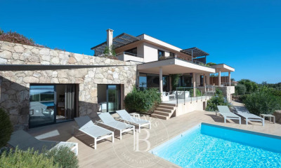 Una proprietà immersa nel verde, ideale per un affitto di lusso a Saint-Cyprien Porto-Vecchio con vista mare. Questa villa progettata da un architetto riunisce tutti i vantaggi per una vacanza di successo: una vista mare sublime, una grande piscina riscaldata con pool house, camere indipendenti e una dependance per ricevere ospiti. Le ampie terrazze arredate invitano al relax, mentre la casa offre numerosi spazi per stare insieme, garantendo al contempo a ciascuno momenti di calma e tranquillità. - Al piano principale, aperto sulla terrazza e sul patio: ingresso, ampio soggiorno che si affaccia sulla terrazza principale con vista mare / salotto / sala da pranzo / secondo salotto con camino, cucina aperta completamente attrezzata / retrocucina con cella frigorifera e lavanderia, patio attrezzato con barbecue, WC per gli ospiti con lavabo. - Zona notte, 3 camere da letto: 1 con vista sul giardino, accesso alla piscina, armadio, TV, bagno con doccia e terrazza, camera 2, affacciata sul giardino, accesso alla piscina, vista mare, armadio, bagno (doccia e vasca), WC separato e terrazza. Camera 3, ampia suite padronale composta da studio, camera da letto, cabina armadio, bagno (doccia e vasca), WC separato con lavabo, terrazza con vista mare. Un salotto TV completa il piano. - Livello superiore: camere 4 e 5, armadi, bagni con WC separati. Accesso a un'ampia terrazza arredata (salotto) e splendida vista mare panoramica. - Camere indipendenti al livello superiore, accessibili tramite una scala esterna nel patio: camere 6 e 7, ciascuna con armadi, bagni aperti con WC separati. Terrazza con vista mare panoramica. - Appartamento indipendente nel cuore del giardino: salone con TV, cucina e zona pranzo, terrazza, WC indipendenti e 1 camera con armadi a muro e bagno con doccia. - Esterni: piscina riscaldata di 17 x 5 m protetta da una tapparella, spiaggia attrezzata con sedie a sdraio, lettini, sala da pranzo estiva, enorme copertina per piscina (frigorifero / lavello / lavastoviglie), ping-pong. Terrazza principale della villa: salotto estivo e sala da pranzo ombreggiata, splendida vista mare, ampio parco paesaggistico.