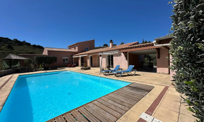 Beneficiando di una bella vista questa dimora/villa (Villa) 251 m², costruita nel 2011, con un terreno di 1206 m² ha 8 vani con 5 stanze da letto, una bagno e 3 WC. Ha ha un soggiorno, una cucina Aperta, una piscina, una terrazza e un garage. Riscaldamento : Pompa di calore autonoma. Varie : caminetto. Onorario : 5.07.