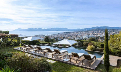 200 m², exposition du séjour Sud et Est, vue dégagée piscine, parc et aperçu mer.