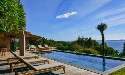 Avec vue mer, piscine chauffée, accés direct à la plage, bateau privé, climatisation et salle de bain en suite.