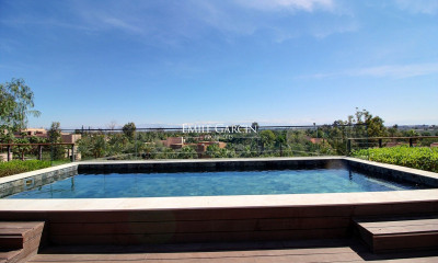 Idéalement situé au sein de la résidence du Four Seasons Resort, ce penthouse est sans conteste l'un des biens les plus exclusifs de la ville ocre. Avec une superficie d'environ 450 m², il a été aménagé par un designer d'intérieur de renommée mondiale. Le raffinement et l'innovation en matière de design sont présents dans chaque pièce de cette propriété, qui se divise en plusieurs espaces, notamment un vaste espace de réception comprenant un grand salon avec cheminée et une salle à manger, un toit-terrasse et la zone nuit. Cette dernière se compose de trois chambres et d'une suite parentale complète avec un spacieux dressing. Vous accédez au rooftop privé d'environ 250 m² par un escalier intérieur. Ce lieu est aménagé avec goût et comprend plusieurs espaces de détente, notamment une grande piscine offrant une vue panoramique à 360° sur la ville de Marrakech, les jardins de la Ménara et la majestueuse chaîne de l'Atlas. En tant que résidence exclusive, elle offre un accès à l'ensemble des services proposés par le Four Seasons, notamment un spa, un centre de remise en forme, deux piscines et un service de conciergerie complet.