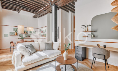 En souplex, un grand salon télévision/bibliothèque de 50m², une chambre avec vélux et salle de bain, douche, WC.