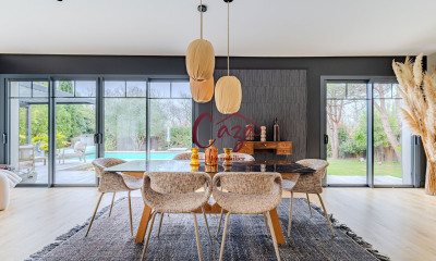 Com orientação sul moradia/ mansão (Villa) 250 m², construída em 2009, com um terreno de 2844 m² compreende 6 assoalhadas das quais 4 quartos, 2 casas de banho e 3 WC. Ela se compõe duma sala de estar 105 m², duma cozinha Americana equipada, duma piscina, dum terraço, duma garagem e de 6 parques de estacionamento. Aquecimento : Individual. Honorários : 2.08.