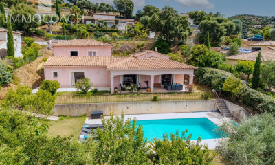Beneficiando de uma bela vista e orientação sul moradia/ mansão (Villa) 140 m², construída em 2014, com um terreno de 1225 m² compreende 4 assoalhadas das quais 3 quartos, 2 casas de banho e 2 WC. Ela se compõe duma sala de estar 45 m², duma cozinha Americana equipada, duma piscina, dum terraço, duma garagem e de 2 parques de estacionamento. Honorários : 3.88.