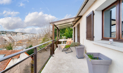 Beneficiando de uma bela vista moradia/ mansão108 m² tem 3 assoalhadas das quais 2 quartos, 1 casa de banho e 2 WC. Ela contém uma sala de estar, uma sala de jantar, uma cozinha Americana, uma varanda, um terraço e uma garagem. Aquecimento : Individual gás. Diversos : parquet. Honorários : 4.00001.