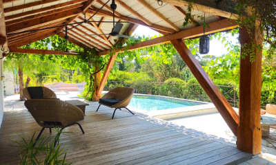 Com orientação sul moradia/ mansão (Villa) 180 m², construída em 2007, com um terreno de 1164 m² tem 6 assoalhadas das quais 4 quartos e 3 WC. Ela contém uma sala de estar 90 m², uma cozinha Separada equipada, uma piscina, 2 garagens, uma cave e 3 parques de estacionamento. Aquecimento : Ar condicionado reversível individual.