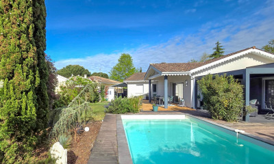 À l’extérieur, le jardin paysager compose un écrin intimiste, sans vis-à-vis. La piscine chauffée de dix mètres prolonge la perspective du séjour et invite à une vie tournée vers l’extérieur, rythmée par la lumière du Bassin. La pergola bioclimatique permet de profiter des espaces extérieurs en toute saison, tandis qu’une dépendance indépendante d’environ 20 m² ouvre de multiples possibilités : atelier, chambre d’amis, espace professionnel ou salle de loisirs.