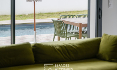 À l'extérieur, profitez d'une piscine chauffée, sécurisée par un rideau couvrant, pour des baignades en toute sérénité. Les grandes terrasses en bois, exposées sud-ouest, sont idéales pour des repas en plein air ou des moments de détente. Le jardin paysager sur une parcelle qui fait au total 896 m2, verdoyant et entretenu, offre une intimité préservée dans un quartier calme et résidentiel.