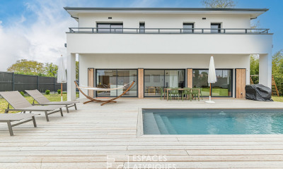 À l'extérieur, profitez d'une piscine chauffée, sécurisée par un rideau couvrant, pour des baignades en toute sérénité. Les grandes terrasses en bois, exposées sud-ouest, sont idéales pour des repas en plein air ou des moments de détente. Le jardin paysager sur une parcelle qui fait au total 896 m2, verdoyant et entretenu, offre une intimité préservée dans un quartier calme et résidentiel.