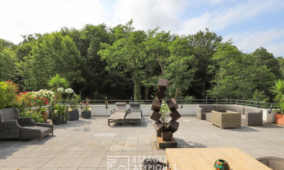 Véritable prolongement du séjour, la terrasse entoure l'appartement et propose plusieurs espaces extérieurs dédiés à la détente, aux repas ou à la réception. Bordée de verdure et sans vis-à-vis, elle surplombe un environnement arboré, créant une atmosphère intime et naturelle. À quelques pas des commodités d'Anglet, ce cadre paisible et boisé invite à la sérénité et à l'évasion.