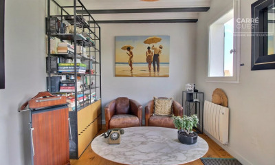 À l'étage, un double séjour lumineux avec cheminée s'ouvre sur une terrasse orientée ouest offrant une vue partielle sur l'océan. La cuisine séparée communique avec une seconde terrasse, accessible depuis la salle à manger et le cellier attenant. Bureau, toilettes indépendantes.
