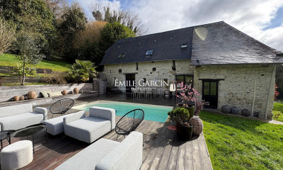 À l'extérieur, un chalet/pool house avec kitchenette accompagne une piscine couverte chauffée (4x8 m) avec pompe à chaleur, idéale pour profiter de l'eau toute l'année. Le terrain arboré garantit intimité et tranquillité.