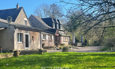 Cet ancien corps de ferme restauré avec goût et authenticité, disposant de 2275m² de terrain, terrasse, cour, pelouse, bois, rivière, constituée de deux maisons en pierre de grés rose reliées par une véranda, mitoyenne par son pignon nord , sans aucun vis à vis, ne pourra que vous séduire.