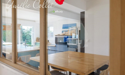 Dès l'entrée, la luminosité naturelle met en valeur les espaces de vie et crée une atmosphère chaleureuse et accueillante. Le salon et la salle à manger s'ouvrent largement sur une terrasse avec accès direct au jardin paysager, offrant une continuité fluide entre l'intérieur et l'extérieur. La cuisine aménagée et équipée s'intègre parfaitement à cet espace de vie, complétée par une arrière-cuisine fonctionnelle qui facilite le quotidien.