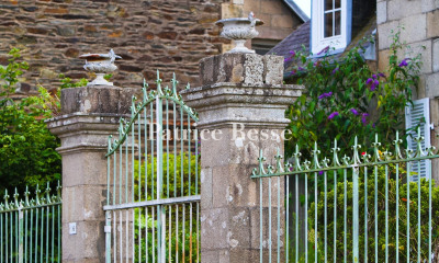 En Bretagne, à 5 min de la mer, au centre d'un village animé, une maison de maître du 19e s. et son parc constructible de près de 3 000 m². L'adresse est située dans une rue adjacente à l'axe principal, à 6 min à vélo de la mer. La maison de maître se distingue de son environnement immédiat. Elle est composée de deux maisons de plan rectangulaire, bâties en pierre de granit taillé, couvertes de toitures en ardoise à deux ou quatre pans et accolées dos à dos. De part et d'autre de la bâtisse principale sont accolés deux petits « pavillons » aux toits à trois pans d'ardoise. Légèrement en retrait de la rue, le logis est protégé par plusieurs éléments. Un portail piéton à deux vantaux à soubassement plein, en fer forgé, est flanqué de deux piliers carrés coiffés de chapiteaux et ornés de vases en pierre sculptés. De part et d'autre, un muret de clôture est surmonté d'une grille également en fer forgé, avec pics de défense. Une autre entrée plus large, de type cochère, est aménagée en façade. Fermée par un portail, elle donne accès à une courte allée qui aboutit à un garage double sur un côté de la demeure. Au-delà des grilles, poussent quelques massifs harmonieux et des fleurs : hortensias, lilas ou encore agapanthes. Cachée par la végétation luxuriante, une petite terrasse exposée sud et dallée de granit est ouverte sur la cuisine. L'ensemble de la propriété est clos de murs. Une troisième entrée est possible au départ de la rue, via une venelle qui longe l'un des pavillons latéraux, puis un haut mur de pierre de protection et enfin une ancienne porte à arc en plein cintre. L'accès mène au fond du parc.