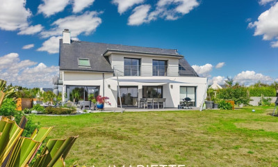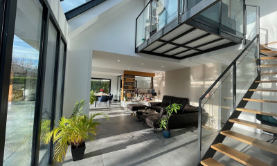 Ouverte sur la nature, la maison respecte pleinement ses extérieurs : grandes baies vitrées, lumière traversante, dialogue constant entre l'intérieur chaleureux et le jardin environnant.