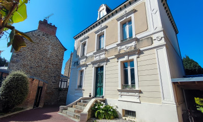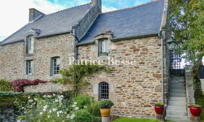 Proche des bords de Rance et de Dinard, une maison du 18e s., ses dépendances et son parc clos et arboré de plus de 2 000 m². Dans le bourg, à moins de 500 m de la place de l'Eglise, la propriété est bordée de murs en pierre et d'un pavillon d'entrée. L'ensemble est composé de la maison, visible de la rue et exposée au sud, puis d'une vaste dépendance avec garage et un étage, au fond du terrain. Le tout est installé dans un vaste jardin arboré et paysagé. La partie ouest du logis principal, avec sa façade à deux travées décalées, élevée de trois niveaux, date du début du 18e s. Le linteau gravé de la porte d'entrée mentionne l'année 1730. Le bâtiment est édifié en moellon de granulite avec pierre de taille pour les baies, coiffé d'une toiture à deux pans en ardoise, percée dans les combles d'une lucarne meunière en pierre de taille avec fronton. La partie est, construite plus récemment selon les mêmes caractéristiques, ajoute une travée à l'ensemble ainsi qu'un escalier extérieur en pierre au pignon est.