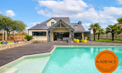 Cette maison réunit avec justesse les critères les plus recherchés aux portes de Rennes : une architecture contemporaine, des volumes généreux, une vie de plain-pied, un jardin sans vis-à-vis, une piscine et des prestations de qualité.