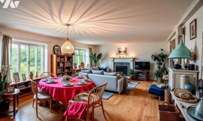 Dès l'entrée, le charme opère : la pièce de vie baignée de lumière, exposée Est-Ouest, dévoile une vue spectaculaire sur la mer grâce à son large bow-window, véritable tableau vivant au fil des marées.