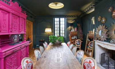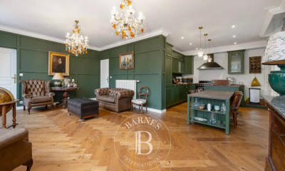 En rez-de-jardin, le hall d'entrée et son vestiaire introduit une lumineuse pièce à vivre aux perspectives originales avec cheminée insert triple face; la pièce dispose de beaux espaces salle à manger et salon avec vue sur le parc boisé et s'ouvre sur une terrasse. En retrait, fermée par une double porte à galandage, cuisine dînatoire aménagée et équipée ouverte sur une terrasse.