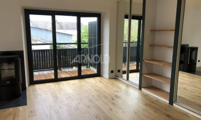 Toujours au rez-de-chaussée, un appartement duplex privatif offre un séjour/cuisine de beau volume, une salle d'eau avec double vasque, douche à l'italienne et WC suspendu. À l'étage, deux belles chambres et une seconde salle d'eau, avec les mêmes prestations, viennent parfaire cet espace indépendant. Un double garage carrelé avec portes motorisées complète ce niveau.
