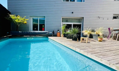 À l'extérieur, à l'abri des regards, un espace détente intimiste avec piscine et préau offre une parenthèse hors du temps.