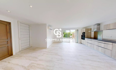 Le premier niveau dévoile un espace de vie lumineux, sublimé par des poutres apparentes, de généreuses ouvertures et des arrondis architecturaux qui adoucissent les lignes contemporaines. La cuisine, véritable élément signature, marie marbre raffiné, finitions haut de gamme et îlot central convivial pour créer une atmosphère à la fois élégante et chaleureuse. Sur ce même niveau, la chambre principale offre un refuge intime et apaisant. Elle dispose de sa salle de douche en marbre, réalisée avec des matériaux nobles et des détails d’inspiration hôtelière, qui renforcent le caractère résolument luxueux de la pièce.