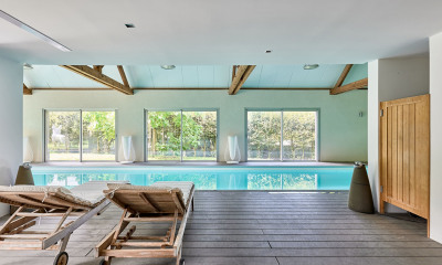 Sept terrasses habillent les façades et accompagnent les différents usages : repas d'été, contemplation, bains de lumière ou d'ombre selon les heures. Deux piscines extérieures, discrètement positionnées, ajoutent à la sensation de liberté. Les matériaux pierre, bois, brique ancrent l'ensemble dans le paysage sans le contraindre. Ici, chaque recoin raconte un usage potentiel, une scène de vie en devenir.