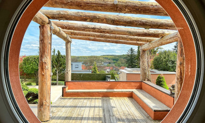 Et dès les beaux jours, les portes fenêtres s'ouvrent sur la terrasse plein sud, face au Parc. Le mobilier extérieur est en place. La vue est imprenable, sur le Parc, la piscine, et Vesoul.