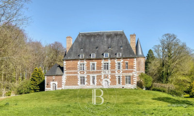 À l'étage, plusieurs suites et chambres (9). Combles isolées et en partie aménagées avec chambres du personnel, lingerie, greniers. Nous retiendrons pour la bâtisse une superficie d’environ 500 mètres carrés, hors partie de combles, qui présentent un potentiel additionnel. Une chapelle, un jardin-potager clos de murs avec orangerie, pièce d’eau et serres ainsi qu’un verger intègrent le parcours romantique qu’offre le parc de 10 hectares au tracé d’origine.