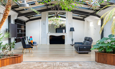 Le rez-de-chaussée se déploie autour d'un espace de réception de 136 m² comprenant un salon chaleureux avec sa cheminée, une salle à manger lumineuse, un bureau ouvert et une cuisine dinatoire. Cette dernière présente un plafond en bac acier apparent renforçant le caractère industriel, en harmonie avec le mobilier noir et métal soigneusement intégré. Dans chacun des quatre angles de la salle à manger, des bacs plantés en pleine terre accueillent des végétaux majestueux montant jusqu'à la verrière : plusieurs palmiers et un splendide bougainvillier rose dont la floraison spectaculaire au printemps et en été illumine la pièce. Une verrière coulissante, située au-dessus de cet espace, ouvre le volume vers le ciel et offre une lumière naturelle abondante. Ce niveau comprend également un dressing, des toilettes et une salle de bains avec douche. L'étage distribue trois chambres, une salle d'eau, un WC indépendant et un dégagement, constituant un espace nuit fonctionnel et apaisé.