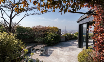 Il bénéficie d'une terrasse exceptionnelle de 200m², paysagée et sans vis-à-vis, agrémentée d'une véranda-salon TV et d'une cuisine d'été. Le rooftop offre une vue panoramique sur Paris avec la Tour Eiffel et Montmartre.