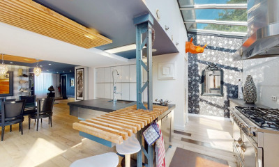 Conçue avec de beaux matériaux (béton, bois, acier, poële en fonte, structure type Eiffel, verrière), cette villa est résolument moderne et très fonctionnelle, avec son entrée sécurisée pour véhicules 2 roues.