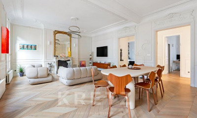 Idéalement situé à deux pas du parc Monceau et de la très prisée rue du Faubourg Saint-Honoré, ce remarquable appartement de 196,72 m² (loi Carrez) prend place au 3 ème étage d'un superbe immeuble haussmannien de grand standing, sécurisé, avec concierge et ascenseur. Entièrement rénové et meublé avec des prestations de haute qualité, ce bien rare offre une alliance parfaite entre le charme de l'ancien et le confort contemporain.