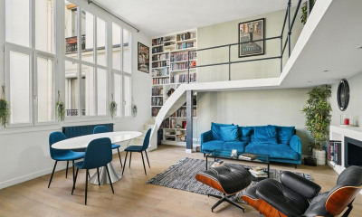 À l'abri des regards, au cœur d'une cour pavée 1900 pleine de charme, ce loft d'habitation rare de 350 m² séduit par ses volumes spectaculaires et sa lumière omniprésente.