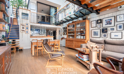 À l'abri des regards, derrière la façade chargée d'histoire de l'ancienne manufacture d'oeillets métalliques d'Ivry-sur-Seine, se déploie un triplex singulier de 131m2 Carrez (140m2 au sol), pensé comme une maison secrète au coeur d'une copropriété emblématique. Accessible directement depuis le rez-de-chaussée, sans voisin au-dessus, ce lieu se vit dans une rare autonomie, loin des codes habituels de l'habitat collectif, avec la sensation immédiate d'un dernier étage posé sur la ville.