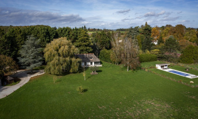 Implantée au sein d'un parc arboré de 4 500 m² avec accès direct à la forêt, la maison développe 167 m² de plain-pied.