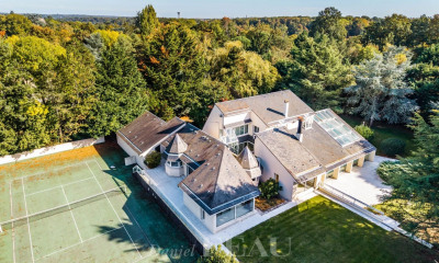 Construite en 1998, puis agrandie en 2008, sur un vaste terrain arboré de presque 3000m2, cette maison spacieuse de 332m2 environ offre de superbes volumes et une répartition des pièces sur deux niveaux. Toutes les pièces sont orientées Sud et profitent d'une belle luminosité et de la vue sur la nature environnante.