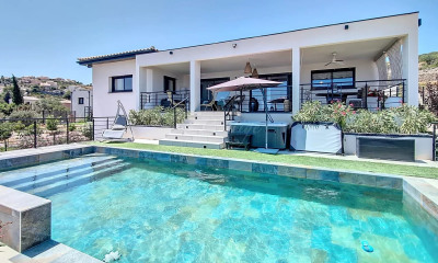 Un large portail électrique s'ouvre sur un domaine de près de 2 000 m², agrémenté d'arbres fruitiers et de plantes méditerranéennes, formant un véritable havre de paix paysager autour d'une villa de qualité et entièrement de plain-pied avec sa piscine.
