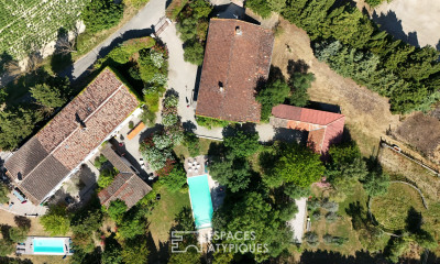 Parmi les atouts de ce domaine, on trouve une grande dépendance servant de garage, ainsi que des terrains aménagés comprenant une piscine, un verger, un potager, un vaste parking, et un belvédère offrant des points de vue imprenables sur la campagne et les montagnes. La maison elle-même a été entièrement modernisée avec de superbes baies vitrées panoramiques, du chauffage au sol dans certaines parties, et une cheminée avec insert. L'intérieur, harmonieux mélange de pierre traditionnelle et de touches modernes en aluminium, est sublimé par un plafond cathédrale qui accentue l'impression de grandeur.